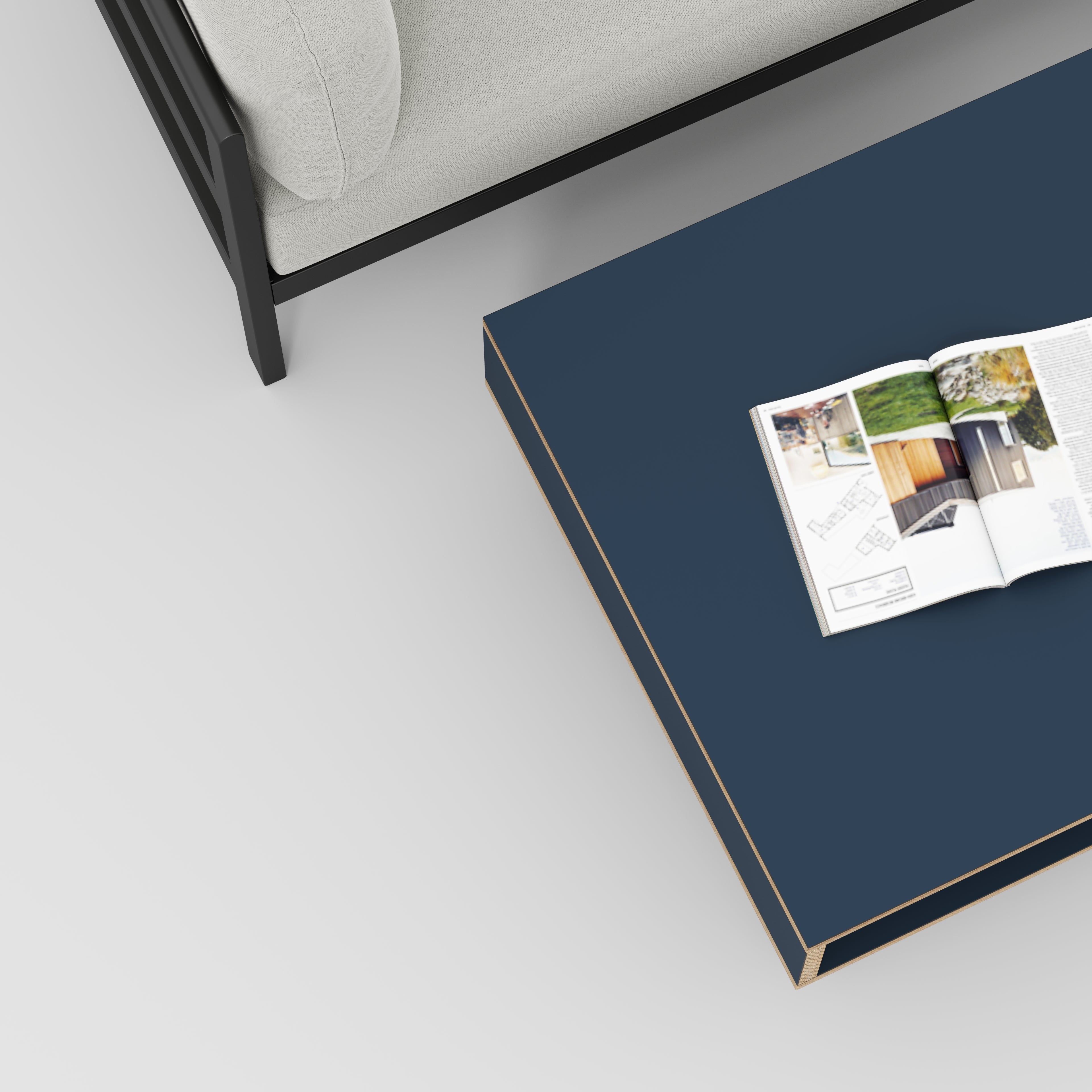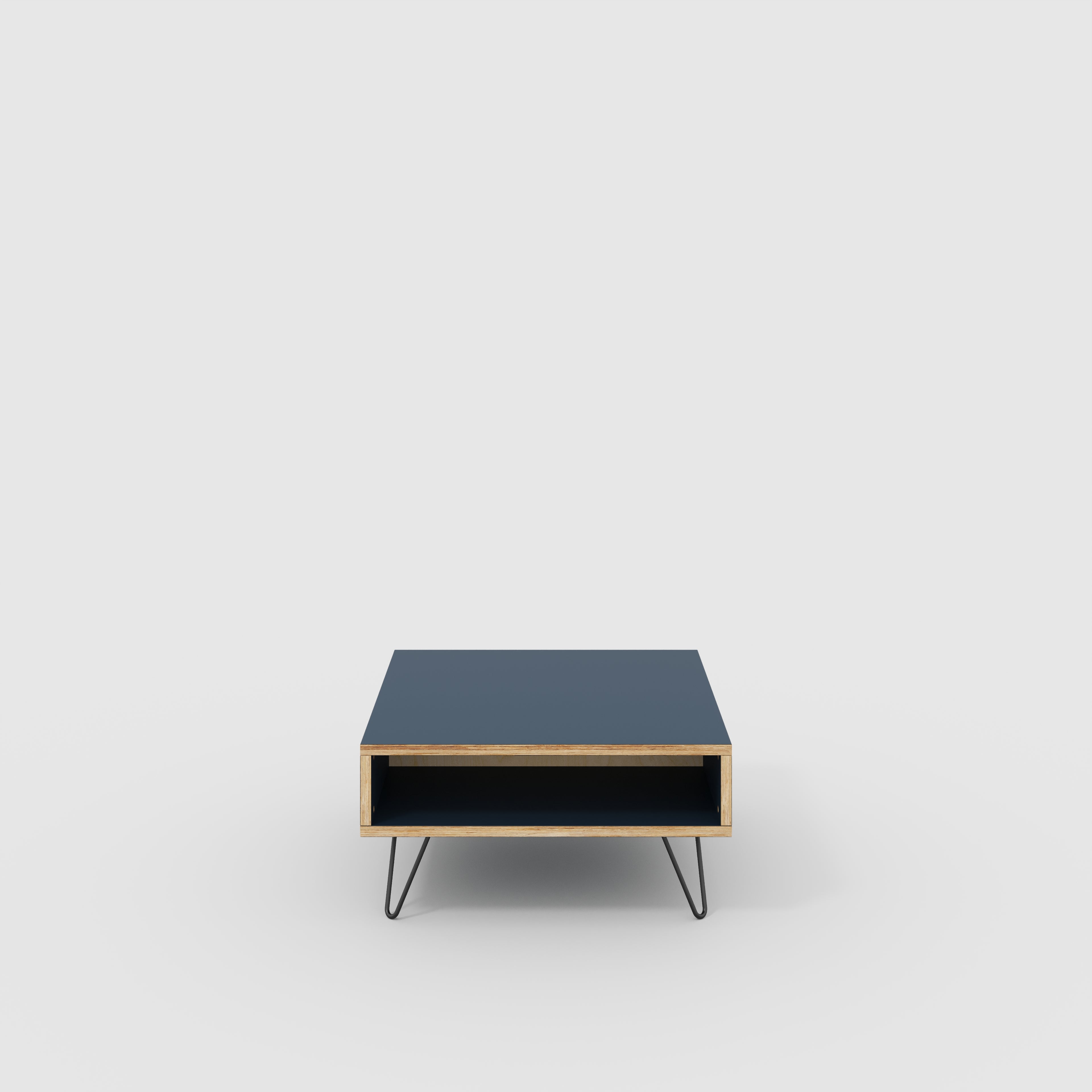 Plywood Coffee Table with Box Storage and Black Hairpin Legs - Formica Night Sea Blue - 800(w) x 800(d) x 400(h)