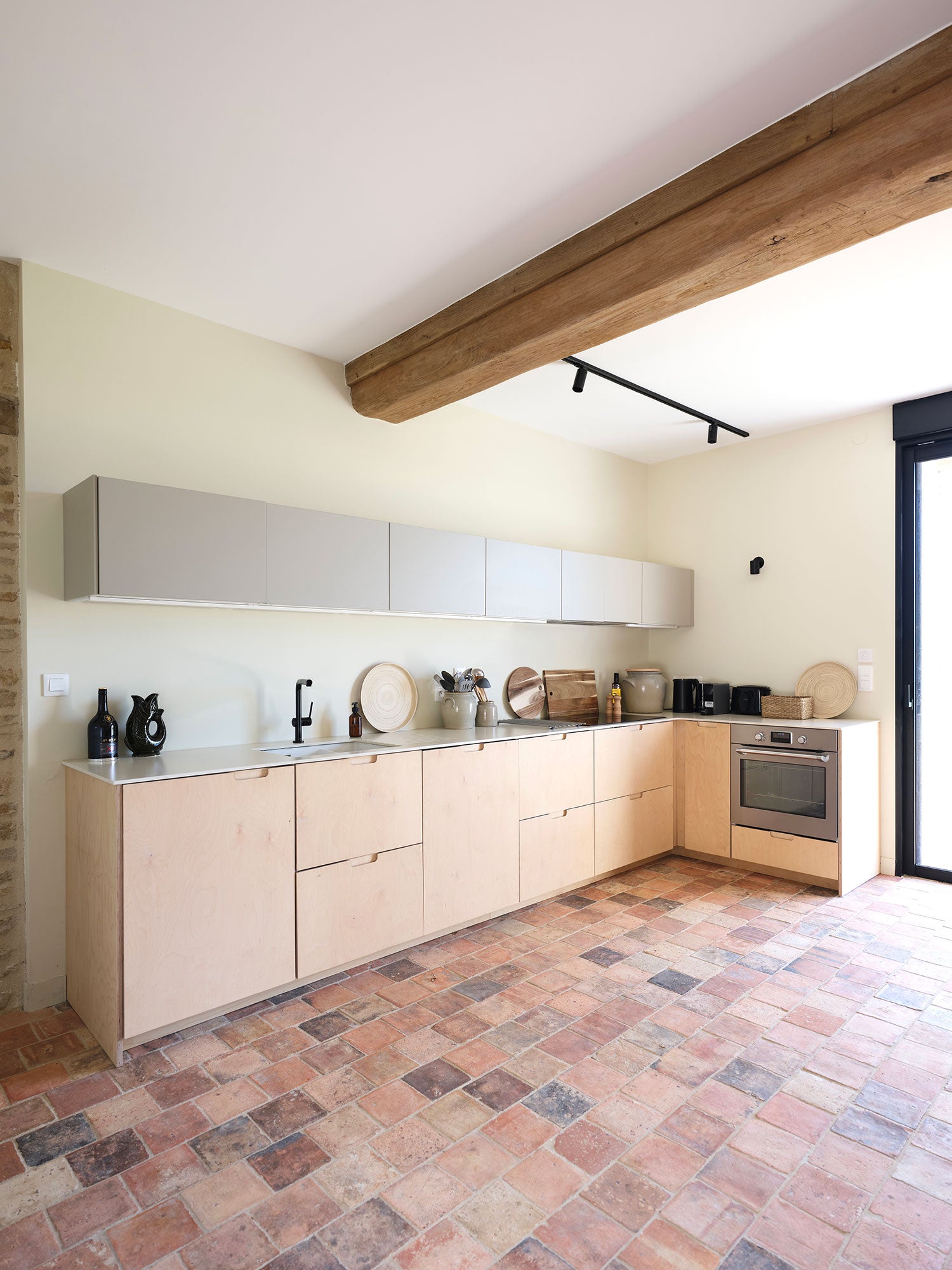 By pairing mellow limestone walls and reclaimed flooring with clean-lined birch ply cabinetry from Made in Ply, they achieved a timeless, serene kitchen that sits comfortably within its rustic setting.