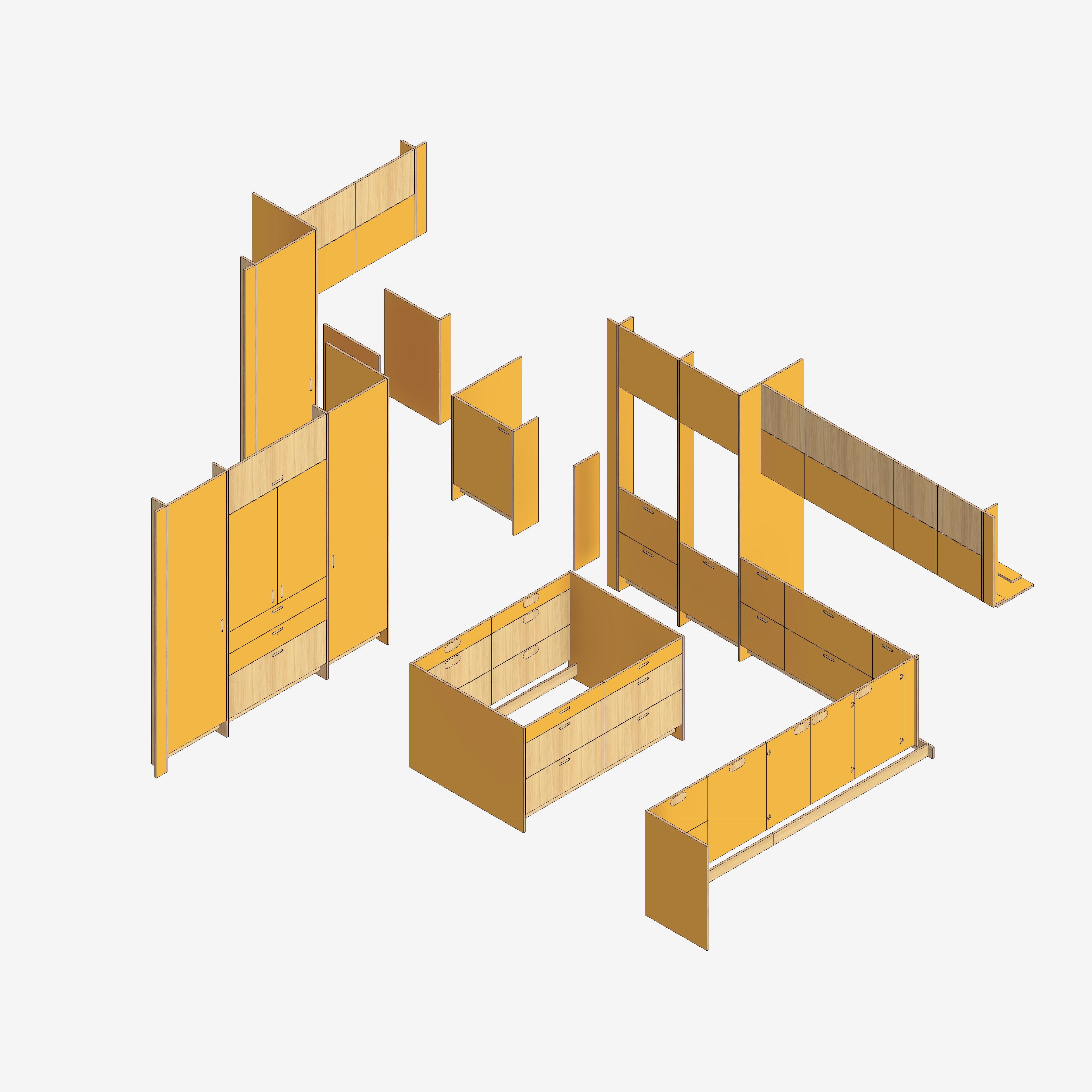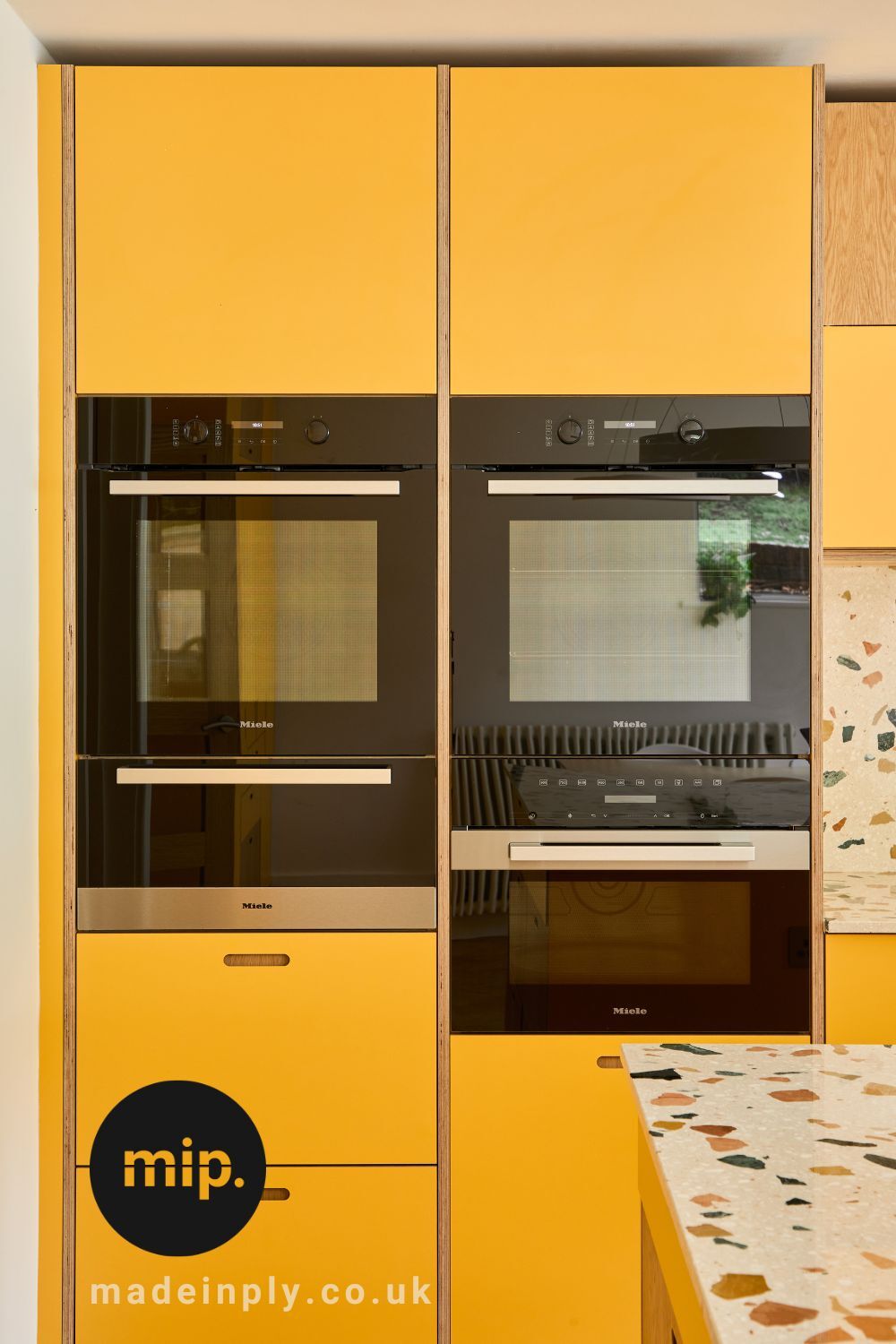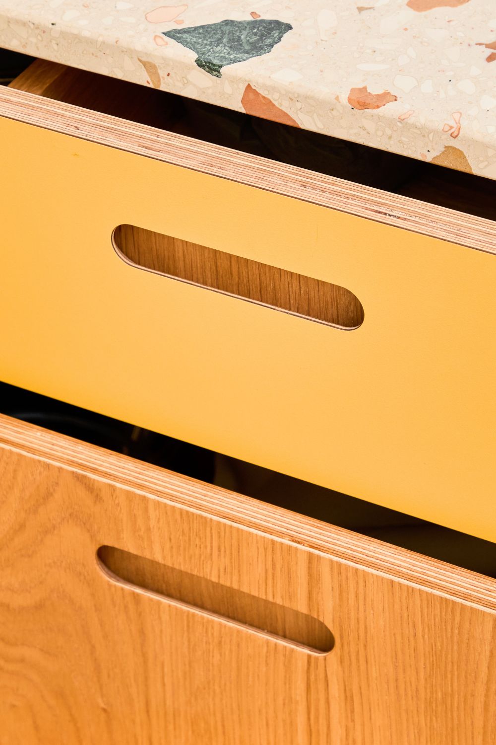 ● Material palette: birch plywood cabinets with Formica Sol (sunshine yellow) fronts and terrazzo worktops