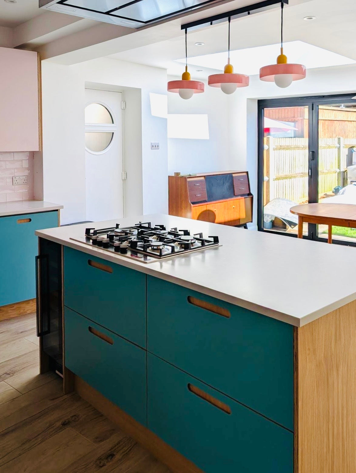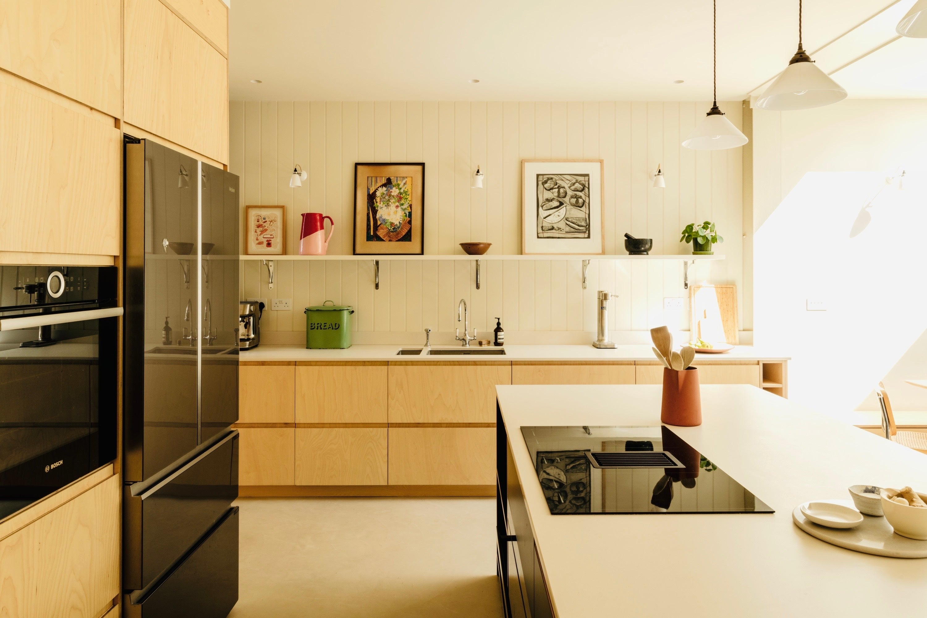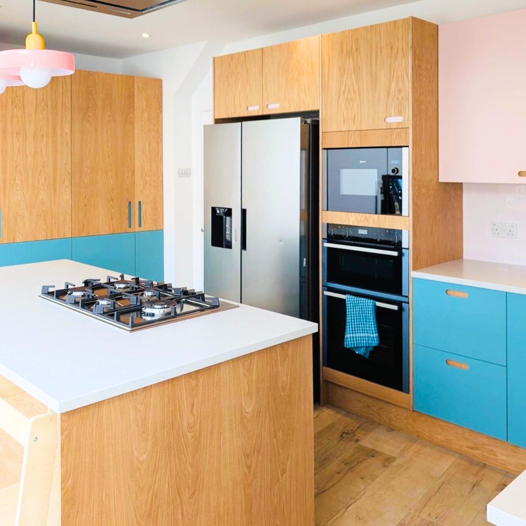 Erin & Fred upgraded their Howdens carcasses with Made in Ply Custom Oak Plywood Fronts, Panels, and Plinths, plus they added bespoke elements like floating shelves and a built-in wine rack.