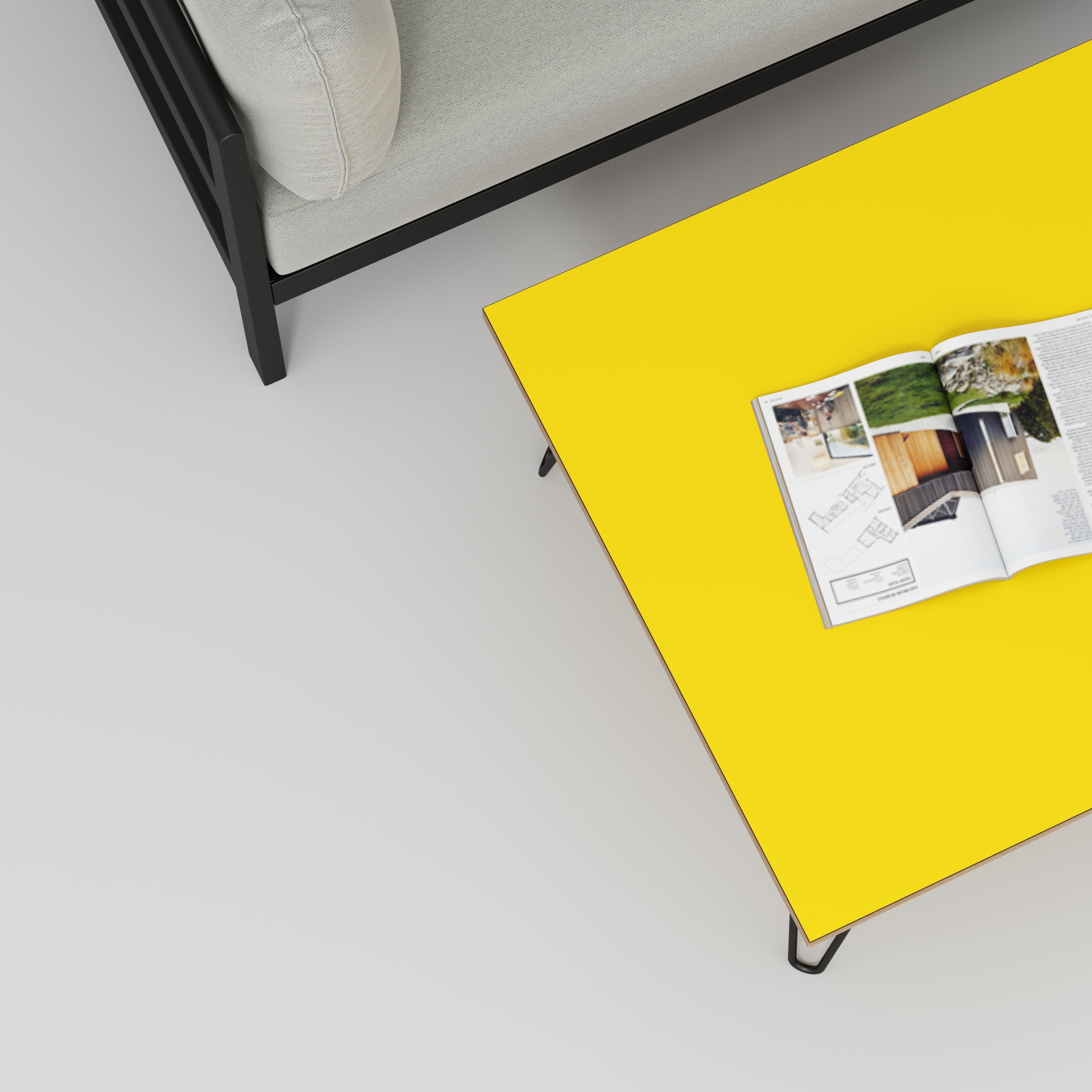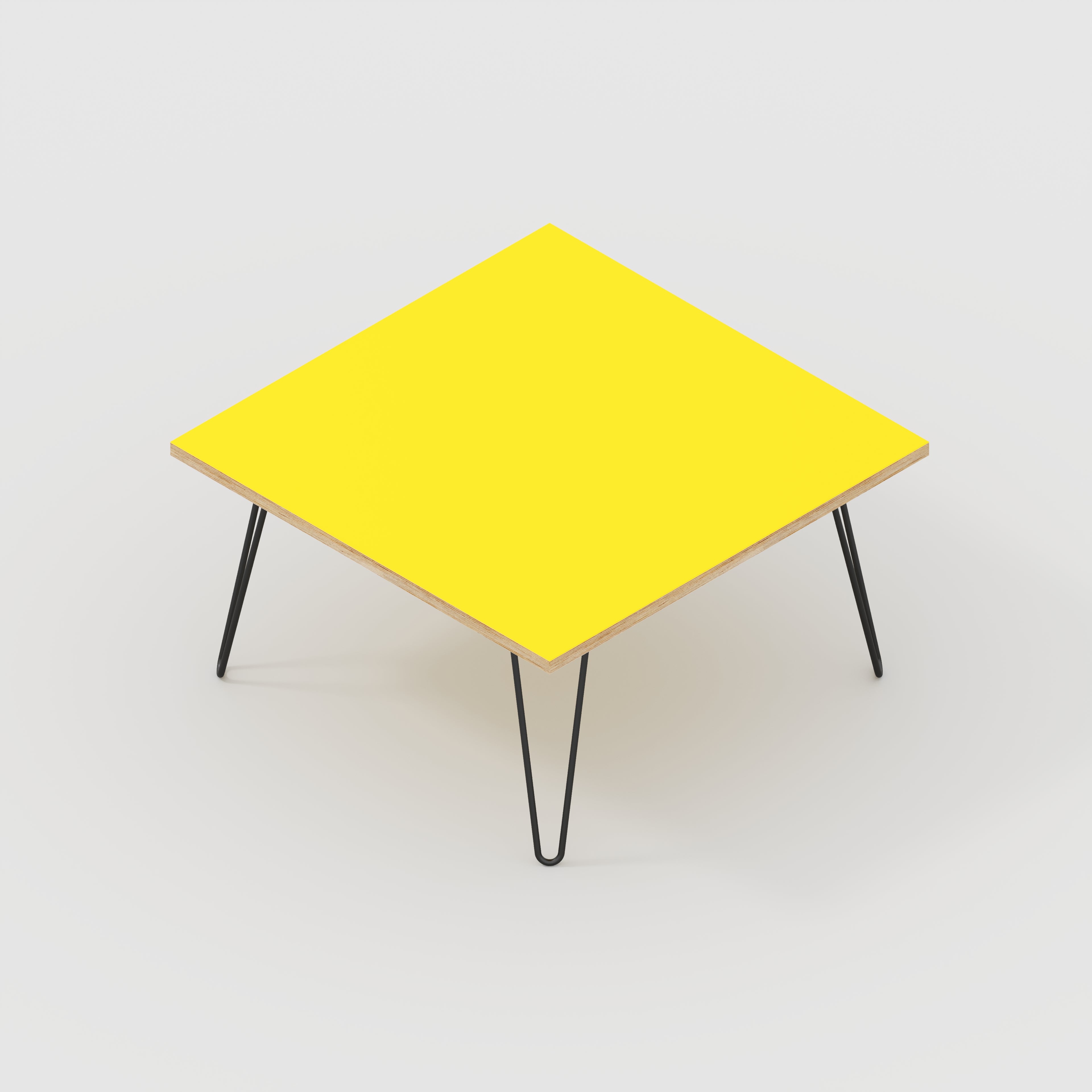 Plywood Coffee Table with Black Hairpin Legs - Formica Chrome Yellow - 800(w) x 800(d) x 425(h)