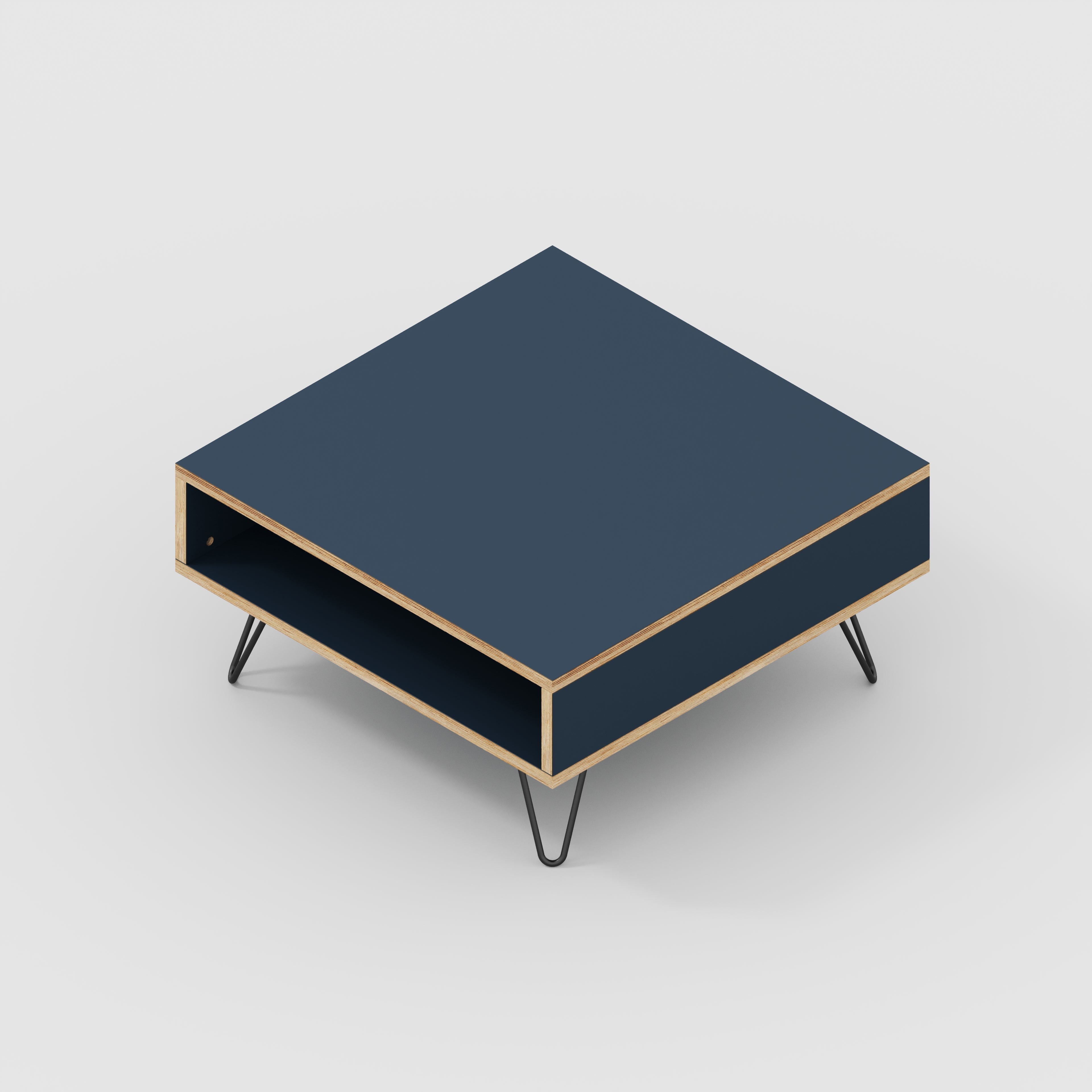 Plywood Coffee Table with Box Storage and Black Hairpin Legs - Formica Night Sea Blue - 800(w) x 800(d) x 400(h)