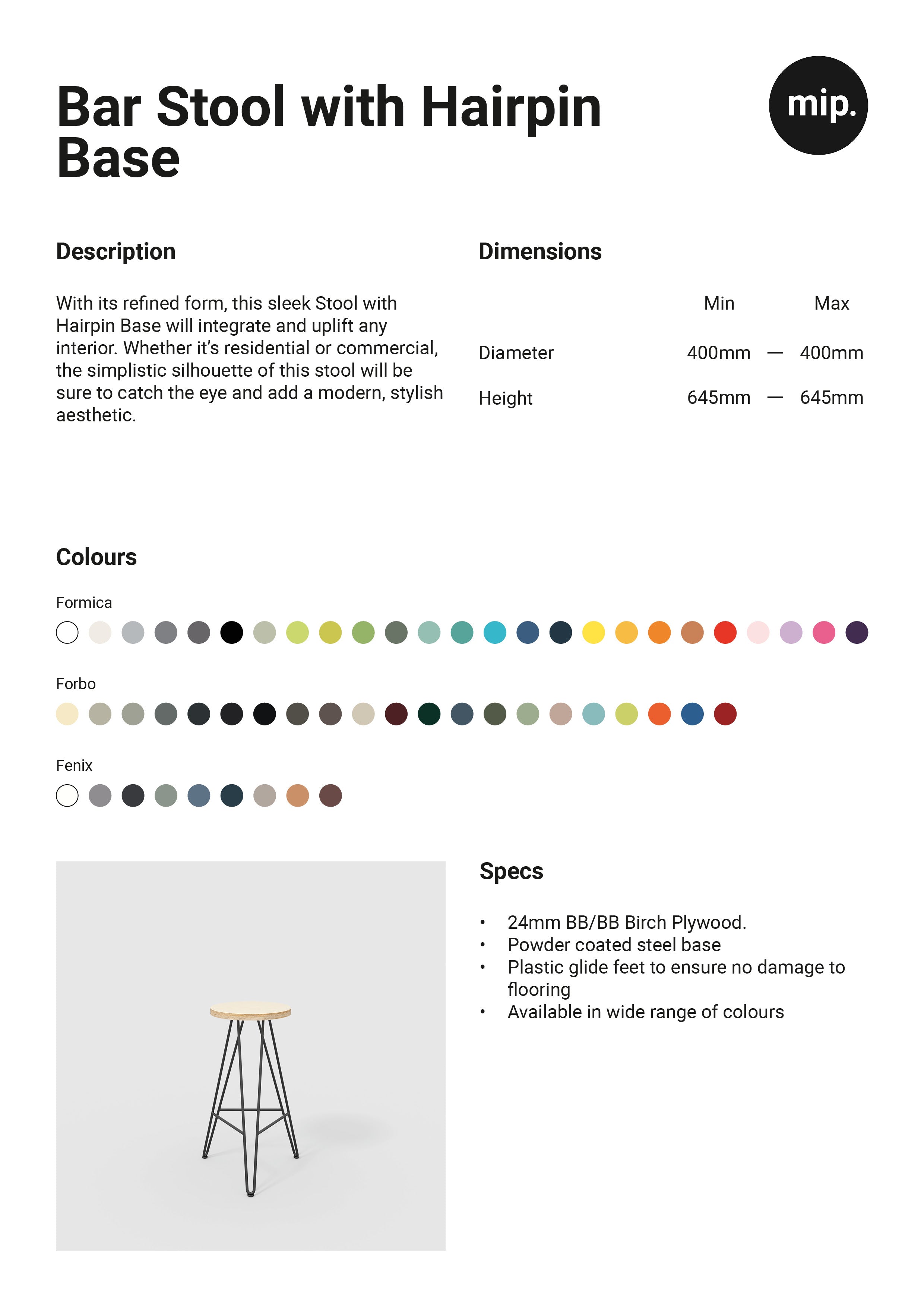With its refined form, this sleek Stool with Hairpin Base will integrate and uplift any interior. Whether it's residential or commercial, the simplistic silhouette of this stool will be sure to catch the eye and add a modern, stylish aesthetic.