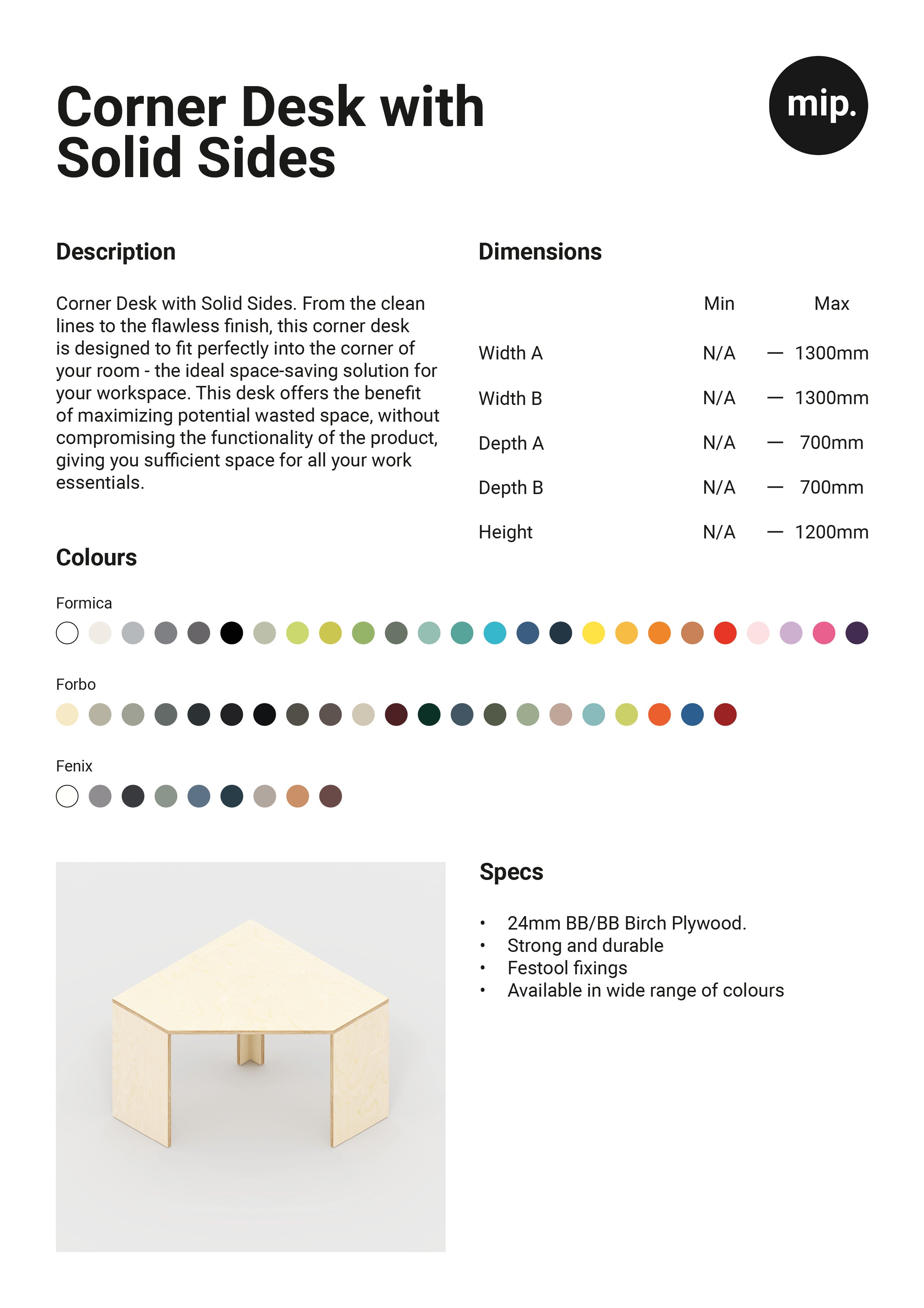 Corner Desk with Solid Sides. From the clean lines to the flawless finish, this corner desk is designed to fit perfectly into the corner of your room - the ideal space-saving solution for your workspace. This desk offers the benefit of maximizing potential wasted space, without compromising the functionality of the product, giving you sufficient space for all your work essentials.