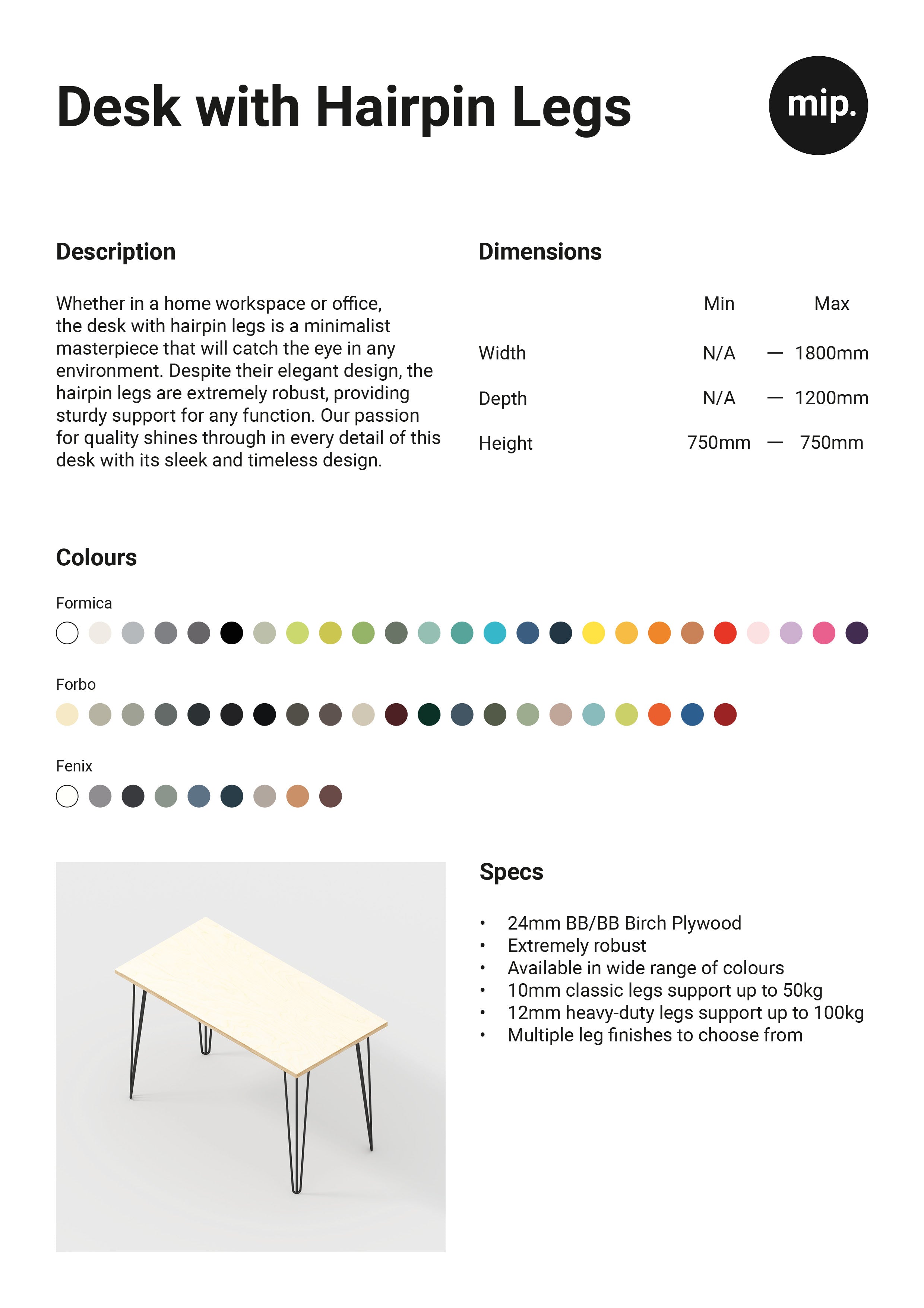 Whether in a home workspace or office, the desk with hairpin legs is a minimalist masterpiece that will catch the eye in any environment. Despite their elegant design, the hairpin legs are extremely robust, providing sturdy support for any function. Our passion for quality shines through in every detail of this desk with its sleek and timeless design.