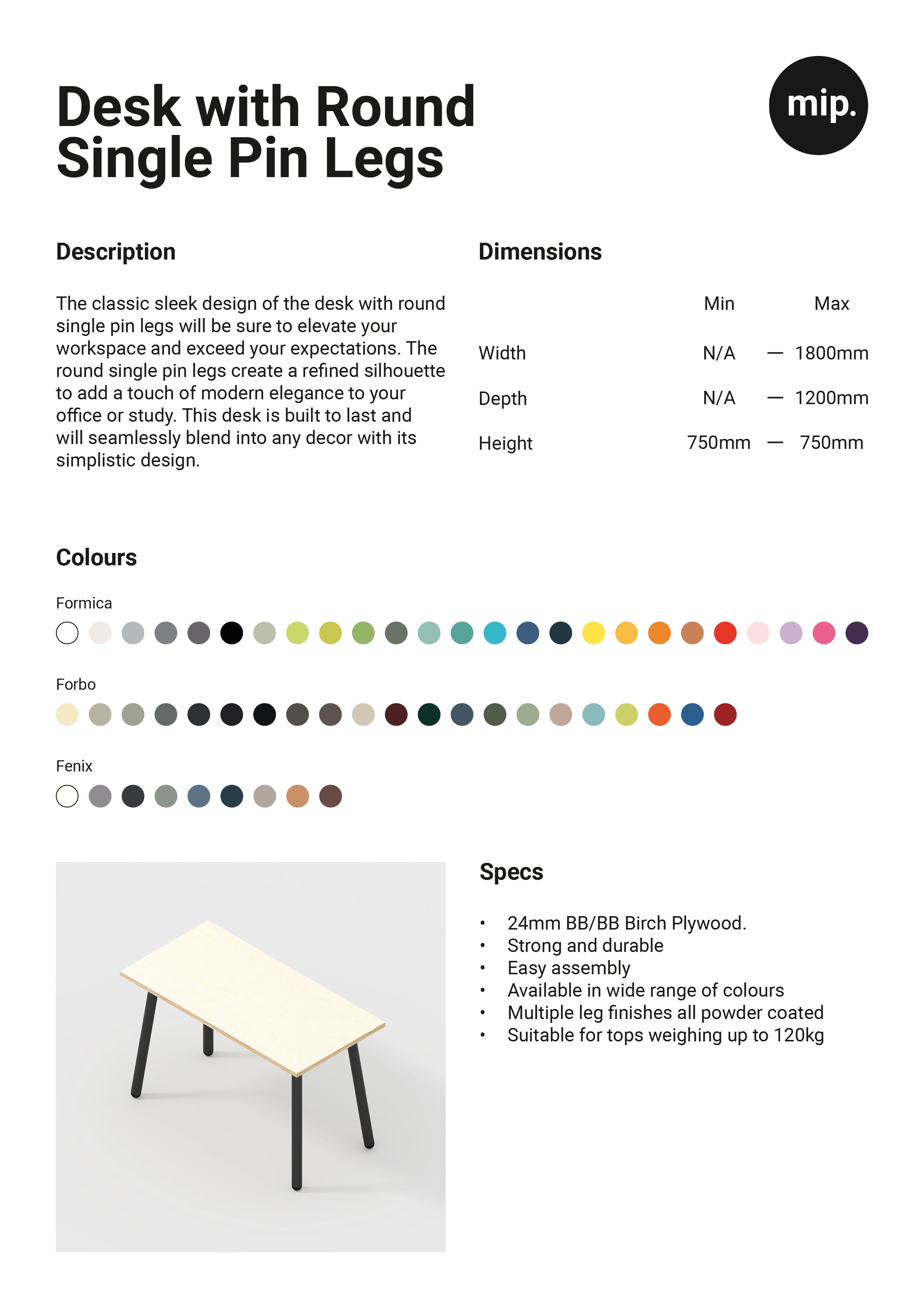 The classic sleek design of the desk with round single pin legs will be sure to elevate your workspace and exceed your expectations. The round single pin legs create a refined silhouette to add a touch of modern elegance to your office or study. This desk is built to last and will seamlessly blend into any decor with its simplistic design.