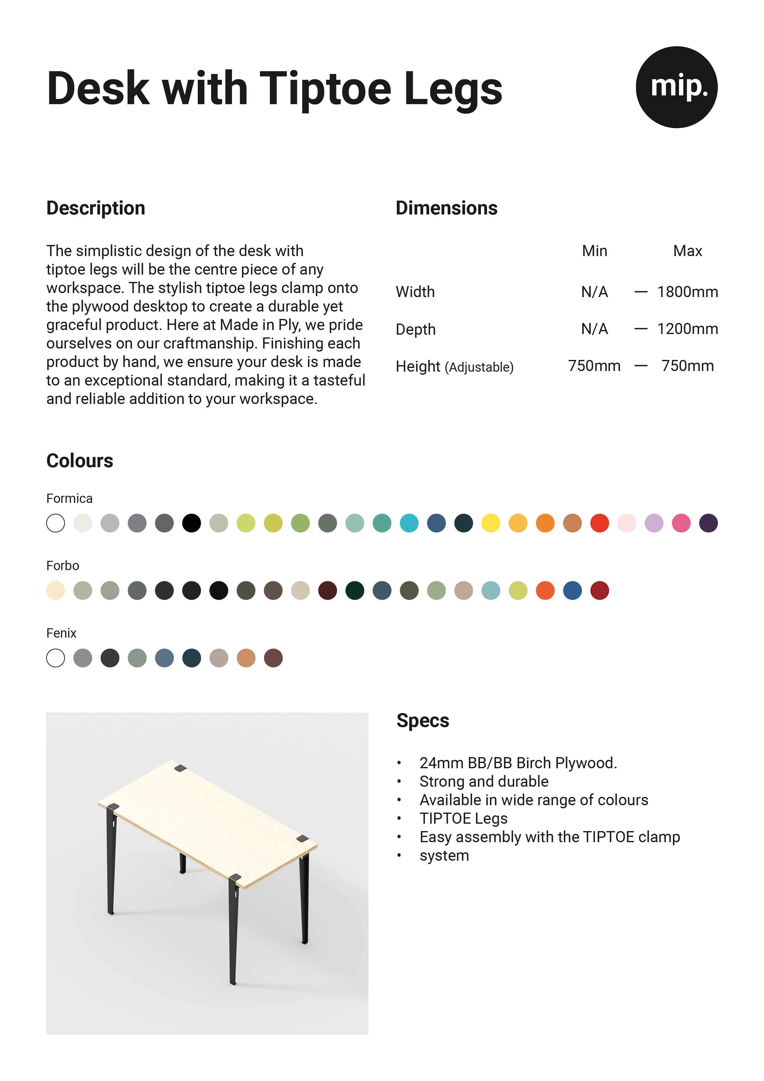 The simplistic design of the desk with tiptoe legs will be the centre piece of any workspace. The stylish tiptoe legs clamp onto the plywood desktop to create a durable yet graceful product. Here at Made in Ply, we pride ourselves on our craftmanship. Finishing each product by hand, we ensure your desk is made to an exceptional standard, making it a tasteful and reliable addition to your workspace.