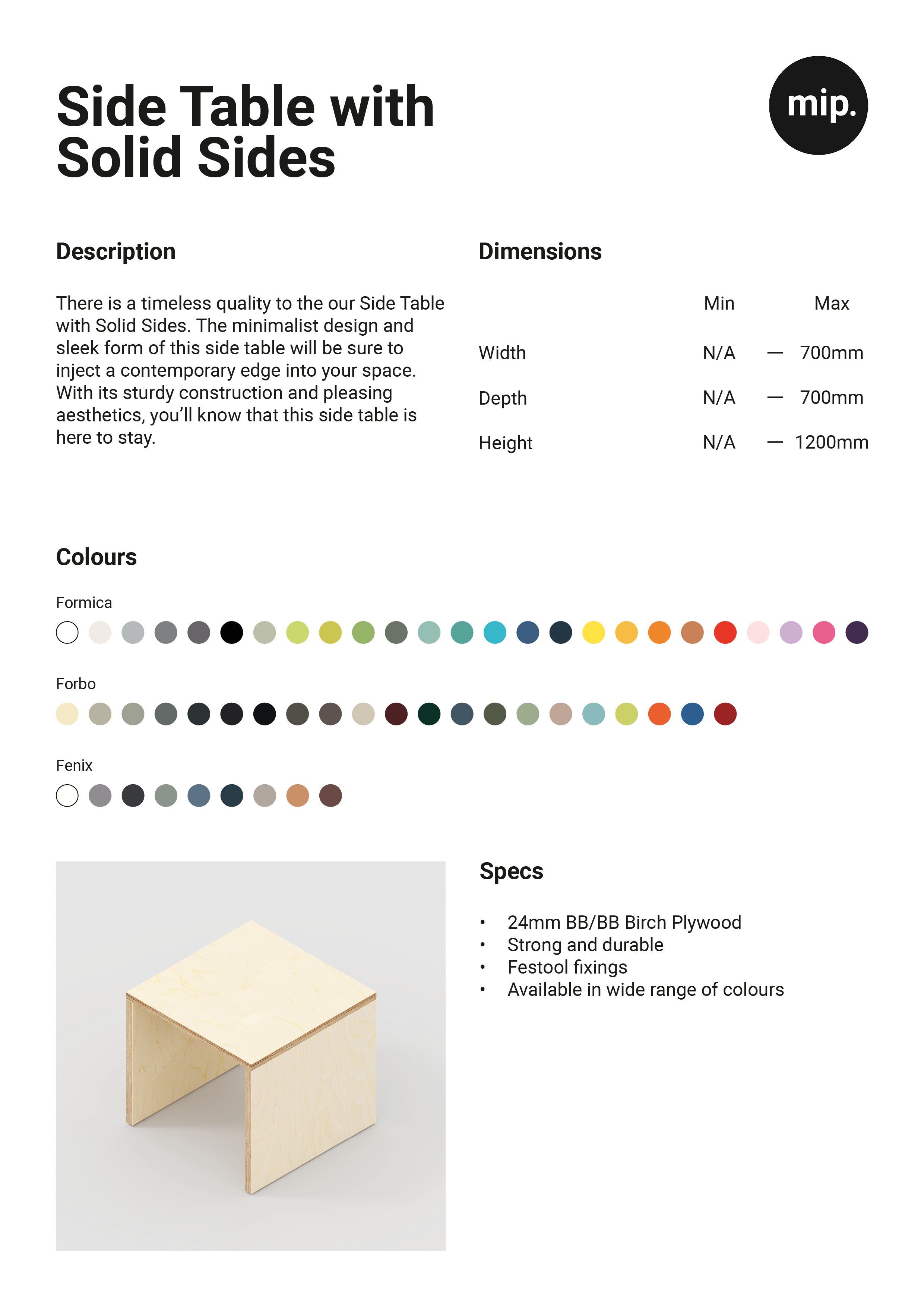 There is a timeless quality to the our Side Table with Solid Sides. The minimalist design and sleek form of this side table will be sure to inject a contemporary edge into your space. With its sturdy construction and pleasing aesthetics, you'll know that this side table is here to stay.