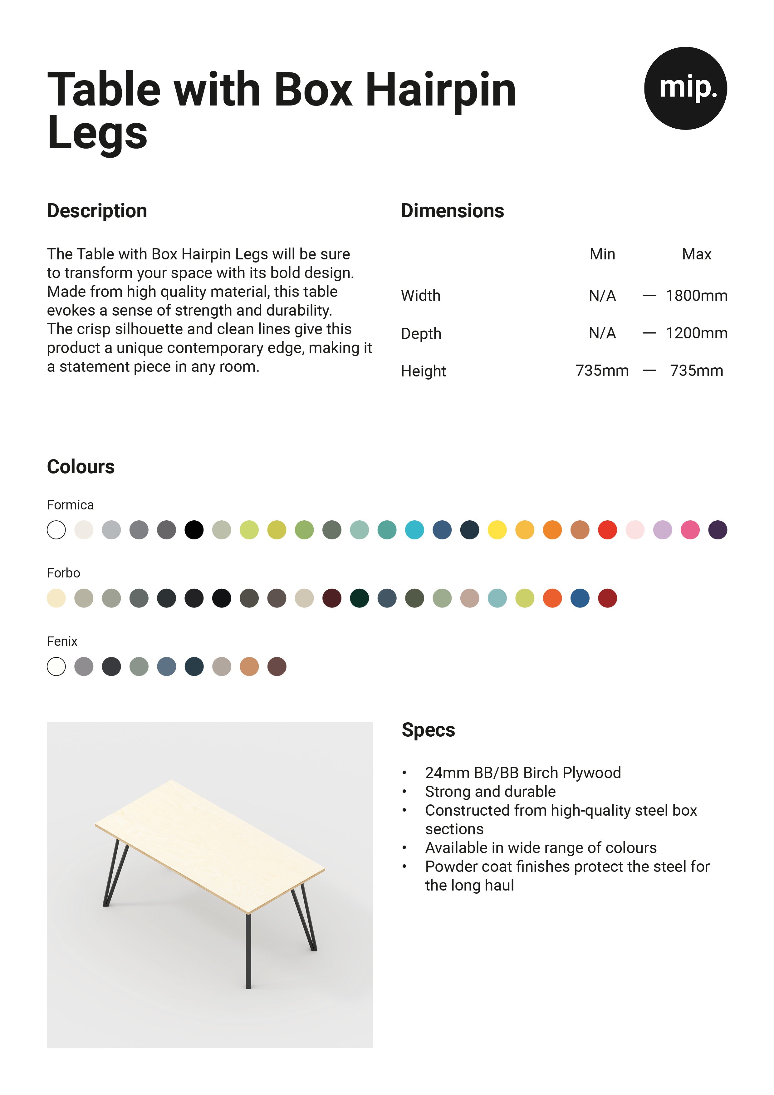 The Table with Box Hairpin Legs will be sure to transform your space with its bold design. Made from high quality material, this table evokes a sense of strength and durability. The crisp silhouette and clean lines give this product a unique contemporary edge, making it a statement piece in any room.