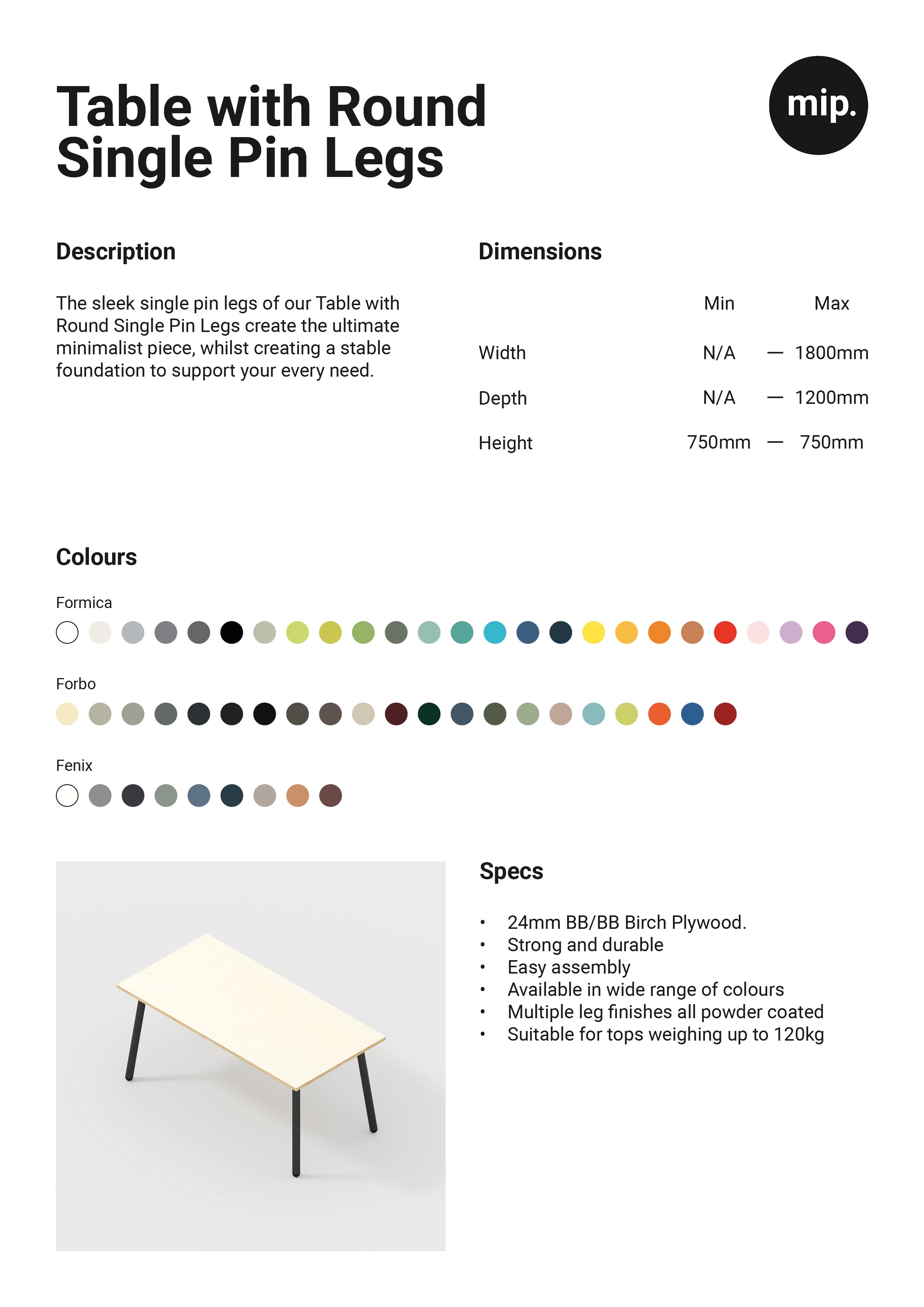 The sleek single pin legs of our Table with Round Single Pin Legs create the ultimate minimalist piece, whilst creating a stable foundation to support your every need.