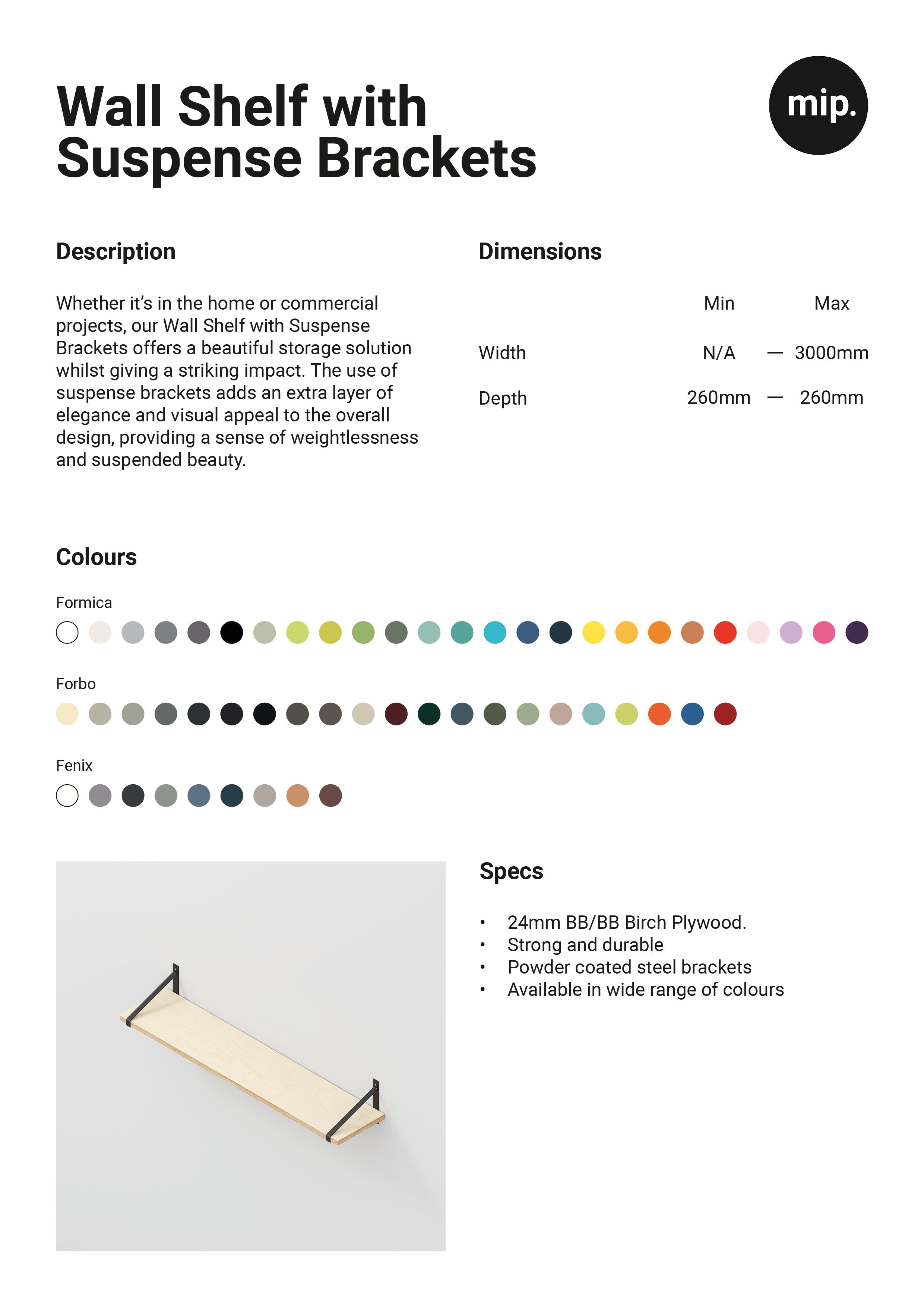 Whether it's in the home or commercial projects, our Wall Shelf with Suspense Brackets offers a beautiful storage solution whilst giving a striking impact. The use of suspense brackets adds an extra layer of elegance and visual appeal to the overall design, providing a sense of weightlessness and suspended beauty.