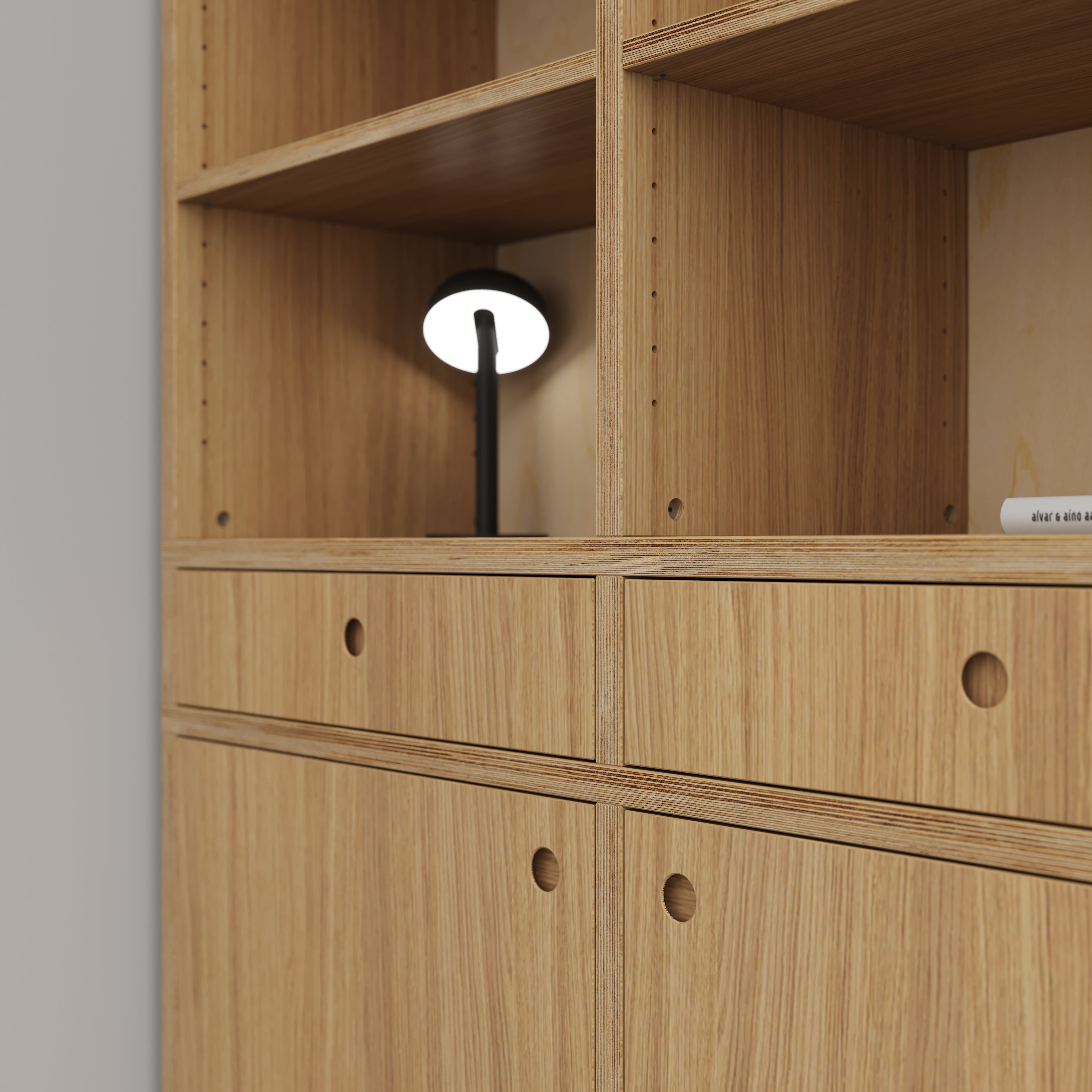 Built in 24mm BB/BB Oak Plywood. All plywood faces and edges are left exposed but sanded smooth and oiled with our own blend of Osmo oils, revealing the beauty of this elegant material.